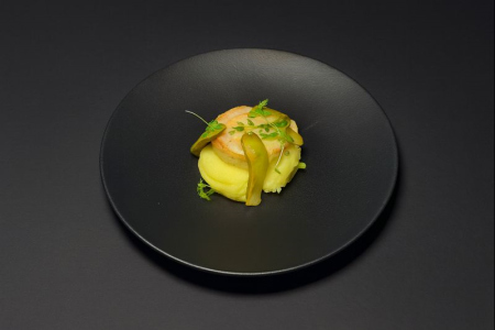 Стейк из лосося с соусом биск и бобами эдамаме