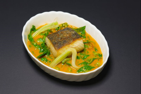 Черная треска с соусом карри и молодыми овощами