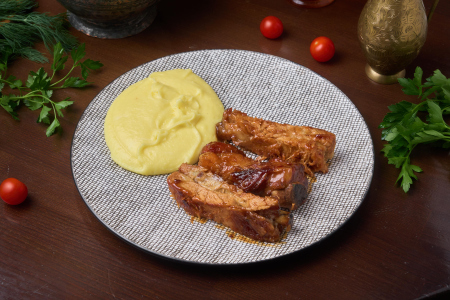 Стейк Нью Йорк с трюфельным пюре и перечным соусом