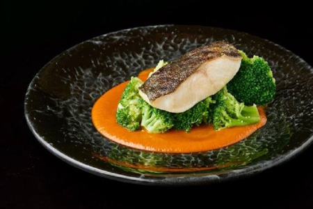 Черная треска с брокколи и соусом карри