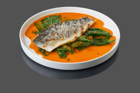 Сибас со шпинатом и средиземноморским соусом