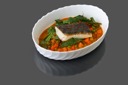 Черная треска с соусом карри и молодыми овощами