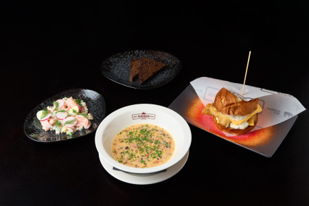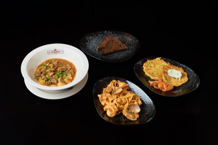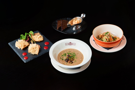 Обед 4 (Трио паштетов/Грибной крем-суп/Овощное папарделле с креветками/Боро