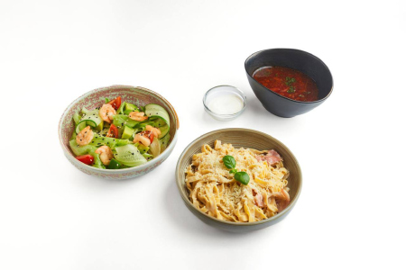 Обед 5 (Драники с лососем и творожным сыром/Суп-гуляш/Паста с морепродуктам